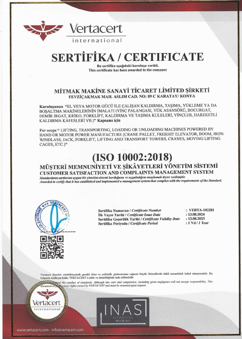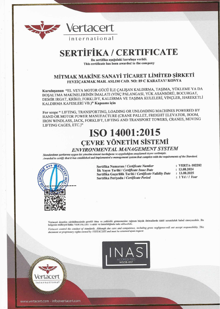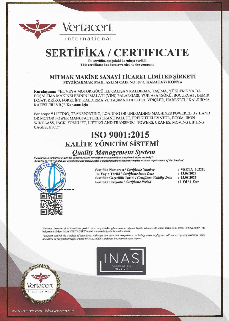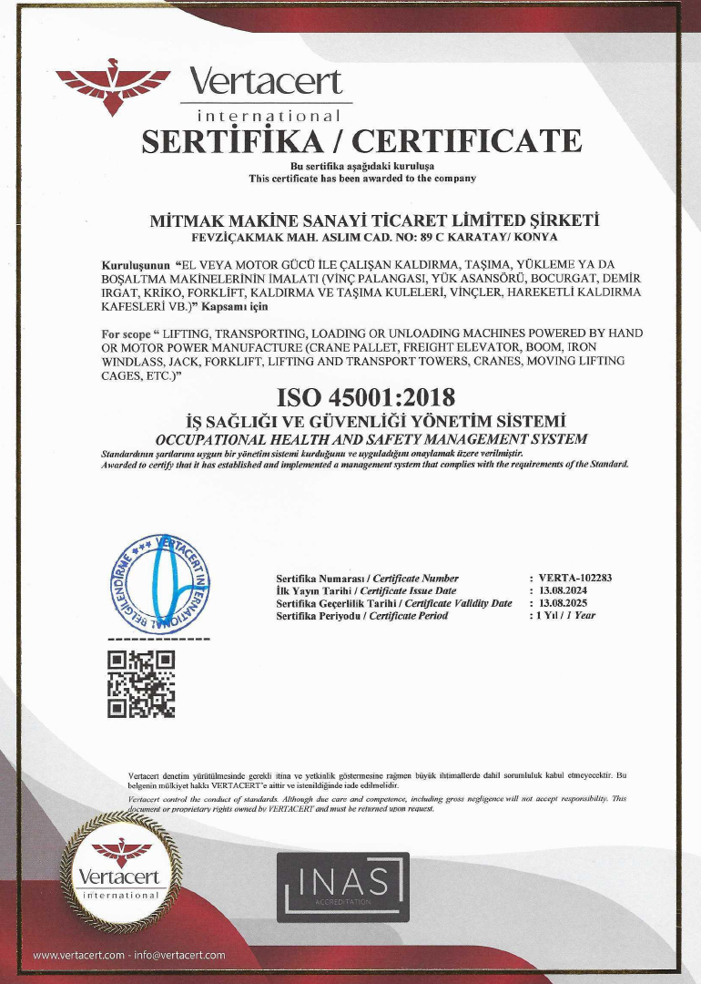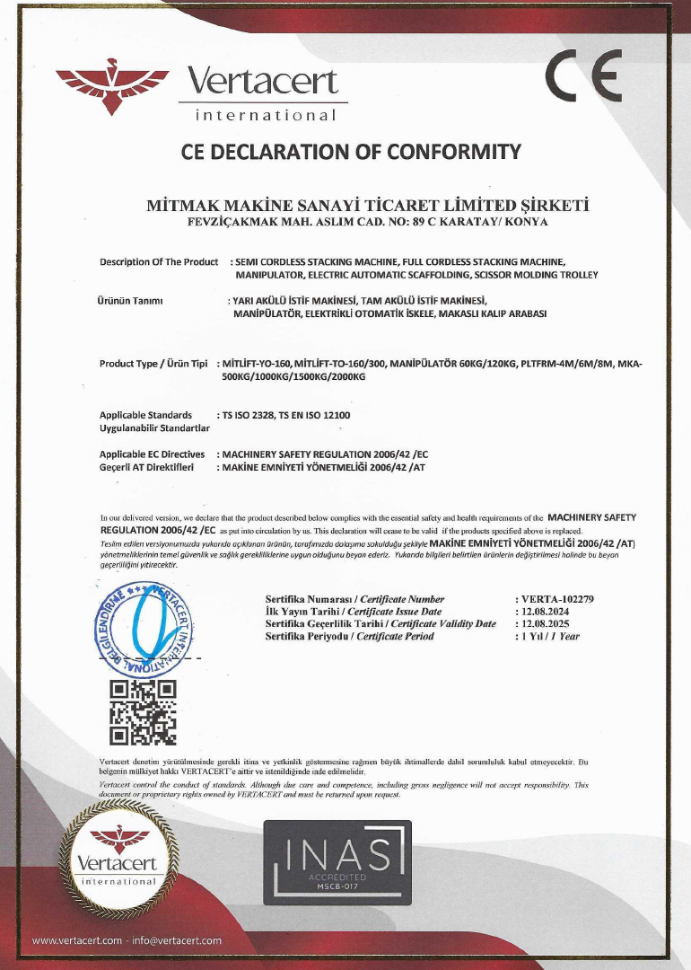 Mitmak Machine is a company based in Konya that specializes in the production of industrial machinery. We offer advanced technology products designed to increase the efficiency of businesses and safely transport heavy loads. Our product range includes various equipment such as stacking machines, manipulators, lifting platforms, and scissor lift trucks.